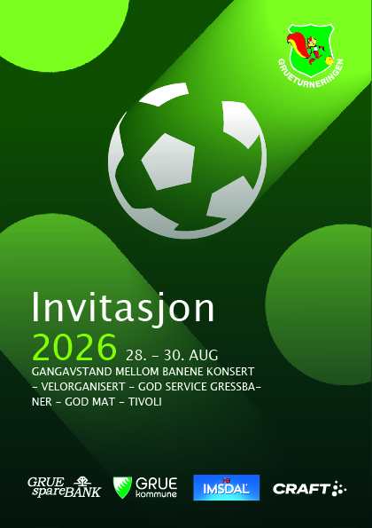 Den siste helga i august, 28.–30. august 2026, er det igjen klart for folkefest på gresset når Grueturneringen arrangeres for 44. gang! Turneringen samler jenter og gutter fra 6 til 14 år, med spill på 3-er, 5-er, 7-er og 9-er baner – alle flotte gressbaner med kort gangavstand.